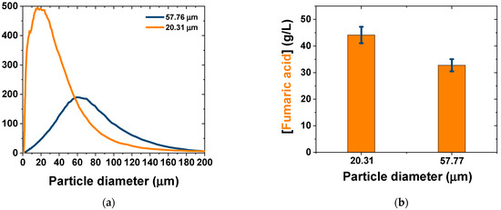 Furthermore, CaCO3 particle diameter was studied to determine the development of a proper morphology. At the same time, the possible effects of minor components of the salt and the shape of the crystals were analysed. In Figure 2A, the particle size distribution of two different kinds of calcium carbonate obtained by FBRM measurements can be observed, obtaining the average diameter of the particles. These results, combined with those from Figure 2B, show how a smaller particle size enhanced the fumaric acid yield. Depending on the particle size of CaCO3, different pellet sizes (and even morphologies) of R. arrhizus occurred. Using CaCO3, which has the smallest particle size, the best production of fumaric acid was reached.