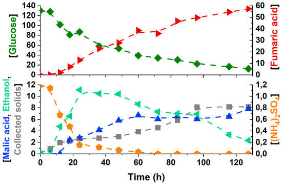 In Figure 6, the average evolution of the relevant substances in the bioprocess, including the biomass, is reflected (runs performed in triplicate). At first glance, an apparent diauxic growth was perceived, with two growing phases in series, as observed by following the dry weight of the solid phases collected during the experiment. Previously, these solids were recognised as biomass [7]. However, the observed behaviour indicates that these collected solids were composed not only of living biomass but also by dead biomass. In addition, these collected solids could also contain a great number of fumaric acid crystals as, due to its very low solubility in water, the acid tends to form crystals above diverse surfaces.