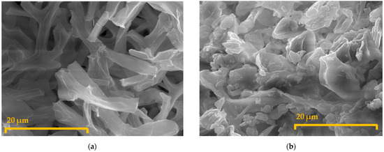 Second, the fumaric acid accumulation over the mycelium surface was studied through a SEM-EDS analysis. For this purpose, several biomass samples were obtained at several experimental time values and observed, providing high-definition images of hyphae (Figure 8) and an approximate quantification of carbon composition in the biomass. Comparing Figure 8A and Figure 8B, it can be seen how micro crystals were precipitated on the mycelium surface.