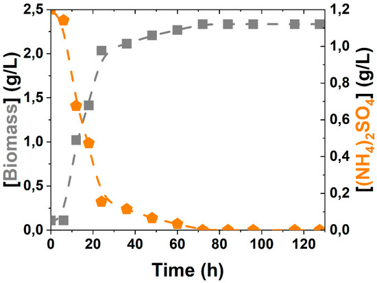 Using these composition values, the molecular formula of the biomass was CH1.80O0.68N0.22. From this average molecular formula and considering that all ammonium consumed from the fermentation broth was fixed and converted into living biomass, its concentration can be calculated (Figure 9), increasing the biomass concentration while ammonium sulphate was consumed, and keeping it constant after ammonium sulphate was totally consumed.