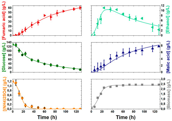 In short, after medium simplification, the production yield clearly increased (from 0.26 to 0.46 gFumaric acid/gconsumed glucose). Therefore, the modified broth was employed for the runs which are the basis of the subsequent kinetic study.