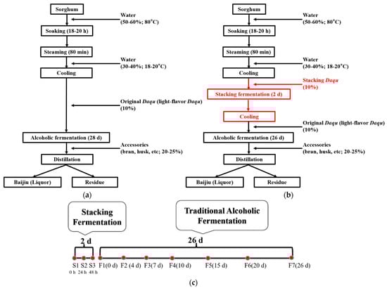 - He, G.; Huang, J.; Zhou, R.; Wu, C.; Jin, Y. Effect of Fortified Daqu on the Microbial Community and Flavor in Chinese Strong-Flavor Liquor Brewing Process. Front. Microbiol. 2019, 10, 56. [Google Scholar] [CrossRef] [PubMed] [Green Version]