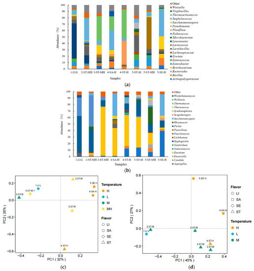 - Xiong, X.; Hu, Y.; Yan, N.; Huang, Y.; Peng, N.; Liang, Y.; Zhao, S. PCR-DGGE analysis of the microbial communities in three different Chinese "Baiyunbian" liquor fermentation starters. J. Microbiol. Biotechnol. 2014, 24, 1088–1095. [Google Scholar] [CrossRef] [Green Version]
