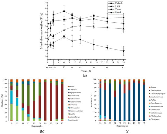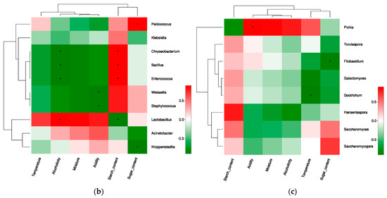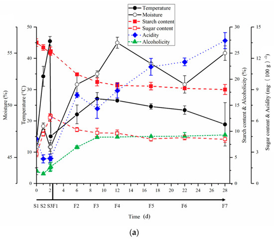 - Zheng, X.W.; Yan, Z.; Nout, M.J.; Smid, E.J.; Zwietering, M.H.; Boekhout, T.; Han, J.S.; Han, B.Z. Microbiota dynamics related to environmental conditions during the fermentative production of Fen-Daqu, a Chinese industrial fermentation starter. Int. J. Food Microbiol. 2014, 182–183, 57–62. [Google Scholar] [CrossRef] [PubMed]