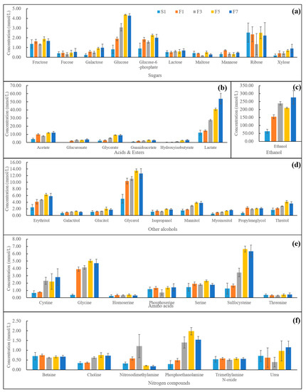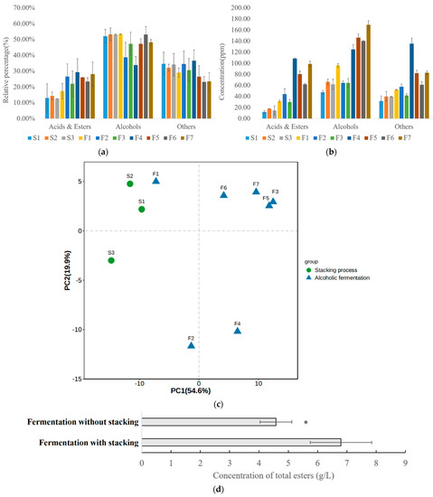 3.4. Metabolite Dynamics during Alcoholic Fermentation with Stacking