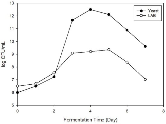 From the previous study, the suitable growth conditions of yeast were a pH value between 4.0 and 6.0; if the pH range was exceeded, the yeast growth was inhibited. Meanwhile, the lactic acid bacteria needed a pH of 5.0–7.0 to produce lactic acid [14]. From Figure 1, the adjusted lemon juice culture with yeast and lactic acid bacteria increased along with the fermentation day. Yeast entered the log growth phase on the second day of fermentation and reached the maximum number of 12.54 log (CFU/mL) on the fifth day; meanwhile, lactic acid bacteria entered the stationary phase on the second day and had the highest number of 9.32 log (CFU/mL), before entering the death phase.