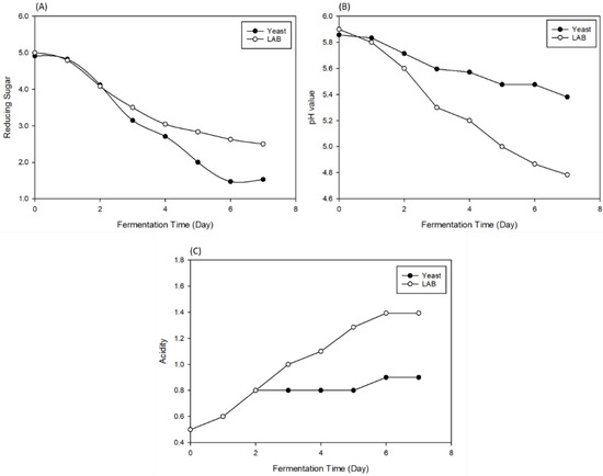 During fermentation, the pH value has a great influence on the growth of microorganisms, and the pH regulation is able to suppress or promote the growth of microorganisms. The changes in pH value in the alcoholic and lactic acid fermentation are shown in Figure 2B. Both fermentations started at pH 5.89–5.90 and indicated a decreasing trend within the fermentation period; however, the alcoholic fermentation did not produce acid. Hence, the pH value decreased from 5.89 to 5.40 during 0–10 days of fermentation and may have been contaminated by other bacteria, while lactic acid fermentation indicated a stably decreasing pH trend from 5.90 to 4.80 during 0–7 days of fermentation. This is because the metabolites of lactic acid bacteria include organic acid, such as acetic, lactic, and propionic acid.