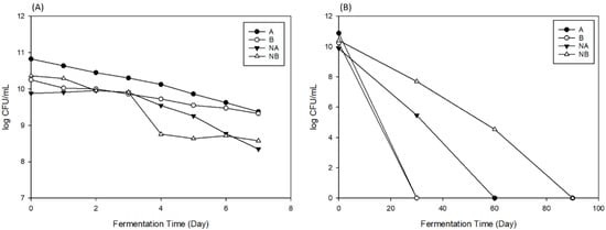 Raw soy sauce refers to the press-fermented moromi, which contains undecomposed sugar and protein that fuel microorganisms’ metabolism. During fermentation, the salinity is the important factor affecting the physical and chemical changes of microorganisms [15]. As shown in Figure 3, the yeast count in Figure 3A and B was 10.83 and 10.25 log (CFU/mL), respectively, on Day 0, while the lactic acid bacteria in Figure 3A and B was 9.89 and 10.39 log (CFU/mL), respectively. However, on Day 30, the yeast was dead in both groups, and the lactic acid showed 5.39 and 7.39 log (CFU/mL) in Figure 3A and B, respectively. When fermentation reached Day 60, the lactic acid bacteria in Figure 3A was dead, while there was 4.43 log (CFU/mL) in Figure 3B; meanwhile, the lactic acid bacteria in group Figure 3B was dead on Day 90. With an increase in fermentation time, the yeast and lactic acid bacteria had a falling trend, but lactic acid bacteria are able to live longer, as they are halotolerant and have a better tolerance to salt solutions. Thus, microorganisms’ physiological activity performed better at 8% salinity than at 12%. Yeast produces amino acids, vitamins, and pyruvates during fermentation which provide nutrients for lactic acid bacteria [16].