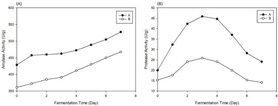 Amylase is able to decompose macromolecule sugar to micromolecules for microbiological usage [17], while protein decomposes to produce peptides and amino acids to enhance the flavor, and the increase in protease activity leads to a shorter fermentation period. Figure 4 shows the results of the enzyme activity during secondary fermentation. The A and B groups’ amylase showed an initial activity of 428 and 372 (unit/g), while this activity increased to 526 and 428 (unit/g) by Day 7. Meanwhile, protease showed an initial activity of 20 and 15 (unit/g) for groups A and B, respectively, then resulted in 21 and 14 (unit/g) by Day 7. Microorganisms produced amylase as products and the starter culture contained sugar; hence, the enzyme activity indicated a rising trend and the amount of carbohydrates improved the amylase activity. Hydrolysis of the protein affected the activity of protease, and thus, the activity did not change within the fermentation period, which was also because of the protein in soy sauce being lower and the fact that no extra addition of protein took place [18].