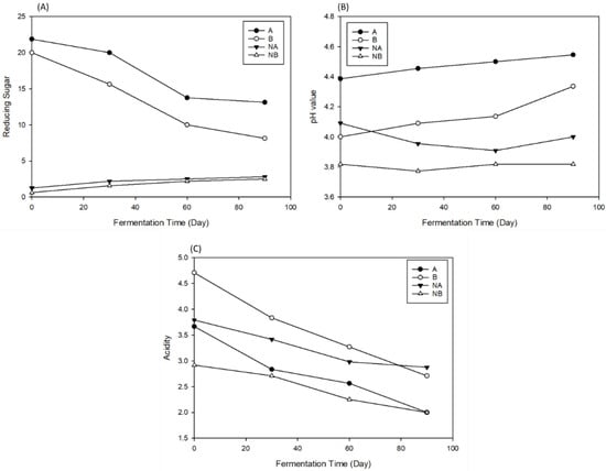 The reducing sugar hydrolyzed to glyceraldehyde, fructose, glucose, etc., with the action of amylase [13]. Yeasts and lactic acids need sugars for growth and metabolism; the amount of reducing sugar allows us to determine the effect of the decomposition and sugar consumption of microorganisms. The reducing sugar during fermentation was 5%, and the initial amount of reducing sugar of groups A, B, NA, and NB was 22, 20, 1.27 and 0.72 mg/mL, respectively (Figure 5A). Along with the fermentation period, the reducing sugar decreased. Group A did not show a significant change within fermentation Days 60–90, while group B showed a decreasing trend. However, at the end of the fermentation, the reducing sugar of both groups reduced slowly. This was due to the salt concentration of soy sauce, which led to the dehydration of cells. However, groups NA and NB resulted in an increase by Day 90, which might be due to the leftover microorganisms in soy sauce decomposing the carbohydrates of lemon into monosaccharides [13].