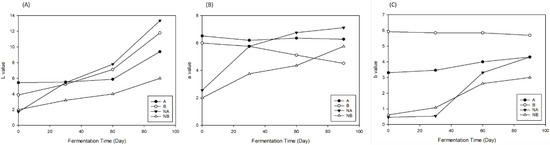 The changes in color parameters in L value (A), a value (B), and b value (C) during secondary fermentation.