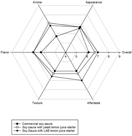 The results of the sensory evaluation of the soy sauce with yeast and lactic acid are shown in Figure 7. The soy sauce with yeast and lactic acid showed higher acceptance than commercially sold soy sauce. For overall acceptance, the soy sauce with LAB had the highest score, while the appearance did not show significant changes among three groups. This means that although lemon juice was added to the soy sauce, there was no effect on the appearance. However, for aroma, the lemon juice enhanced the smell and flavor of the soy sauce and was acceptable to consumers. The soy sauce with yeast and lactic acid bacteria were both had higher scores than commercially sold soy sauce. For taste acceptance, there were no significant differences among them.