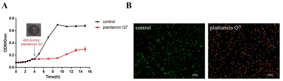 The plantaricin Q7 concentrated through the ultrafiltration tube was added at the start of logarithmic growth period of L. monocytogenes, so that the final concentration of plantaricin Q7 was 400 AU/mL, and BHI without plantaricin Q7 was used as a control. Then, the samples were incubated at 37 °C. The bacterial growth was monitored by Microplate Reader (Thermo Scientific Multiskan FC, Waltham, MA, USA) at 600 nm every 2 h.