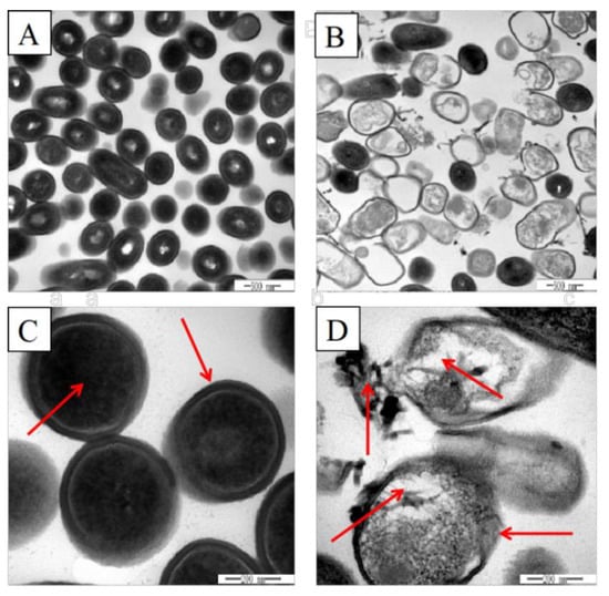 Effects of plantaricin Q7 on the morphology and internal structure of L. monocytogenes. (A,C) Control group, (B,D) treatment group, (A,B) 40,000× magnification, (C,D) 150,000× magnification. The red arrows in Figure 2C,D pointed to the cell wall and cell content of the bacteria in the control group and the treatment group respectively.