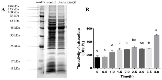 Sodium dodecyl sulfate-polyacrylamide gel electrophoresis (SDS-PAGE) was used to analyze the leakage of intracellular biomacromolecules according to the method reported by Kang et al. with minor modifications. L. monocytogenes cells were treated with or without 400 AU/mL plantaricin Q7 for 10 h at 37 °C. The harvested cells were washed three times and then resuspended in 1 mL of PBS to obtain an OD600nm = 1.0. Next, ultrasonic treatment was carried out in an ice environment for 15 min. The obtained L. monocytogenes whole-cell protein contents were added with the protein loading dye, and the mixtures were boiled for 5 min and cooled on ice [23]. Electrophoresis was carried out using 12% separating gel and 5% stacking gel based on an SDS-PAGE gel preparation kit (Solarbio, Beijing, China). Finally, the coomassie brilliant blue R-250 (Sigma-Aldrich, Sigma-Aldrich, MO, USA) was used for staining [24]. For the determination of lactate dehydrogenase activity (LDH), the assay procedure was based on the method in the instructions of Nanjing Jiancheng lactate dehydrogenase kit.