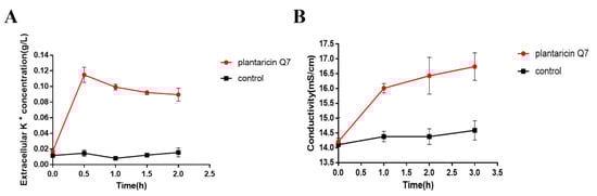 Effects of plantaricin Q7 on K+ concentration and electrical conductivity of L. monocytogenes. (A) K+ concentration. (B) Electrical conductivity. The data were shown as mean ± SD (n = 3).