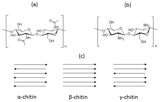 Basic structures of chitin (a) and chitosan (b) and chitin allomorphs (c). The tips of the arrows indicate the positions of the reducing ends of the chains.