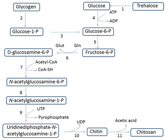 Free glucose or that derived from trehalase-catalyzed hydrolysis of trehalose is converted to glucose-6-phosphate (G-6-P) by hexokinase. If the starting material is glycogen, its depolymerization, catalyzed by glycogen phosphorylase, releases glucose-1-phosphate, which is also converted to glucose-6-phosphate by phosphoglucomutase-catalyzed isomerization. Irrespective of its origin, G-6-P is then isomerized to fructose-6-phosphate (F-6-P) by phosphoesoisomerase. F-6-P is then converted to N-acetyl-D-glucosamine-6-phosphate (GlcNAc-6-P) through two consecutive transfer reactions of an amino and acetyl group where glutamine and acetyl CoA, respectively, act as the donors. Isomerization step of GlcNAc-6-P catalyzed by phospho-N-acetyl glucosamine mutase yields 1-phospho-N-acetyl-D-glucosamine (GlcNAc-1-P). The chitin precursor, UDP-GlcNAc, is formed upon reaction of GlNAc-1-P with uridine triphosphate (UTP) and serves as a N-acetylglucosamine (GlNAc) donor for the sequential addition of GlcNAc units to the non-reducing terminus of the growing chain catalyzed by chitin synthase [42]. The linear chains spontaneously assemble to form microfibrils with varying diameters and lengths. In a further step, chitin deacetylase (CDA, E.C. 3.5.1.41) brings about the deacetylation of GlcNAc residues of chitin, thus leading to chitosan [43]. The formation of GlcNAc and UDP-GlcNAc takes place in the cytosol, while chitin synthesis occurs in specialized domains of the cell membrane. Some enzymes involved in chitin syntheses, such as glutamine-fructose-6-phosphate amidotransferase (EC 2.6.1.16), UDP-N-acetylglucosamine pyrophosphorylase (EC 2.7.7.23), and chitin synthase (EC 2.4.1.16), are subjected to tight regulation and limit the rate of chitin production [41,44].