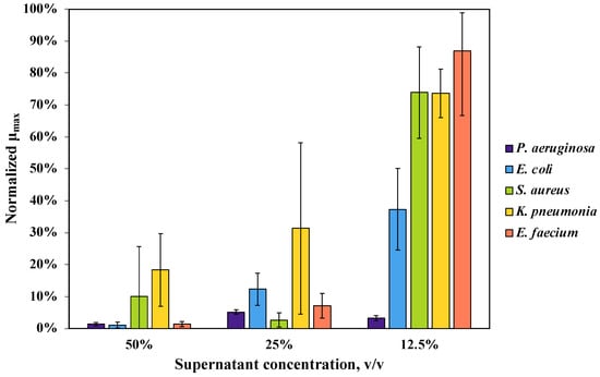 Effect of various concentrations of supernatant of aerobically grown Zm4 culture on the maximum specific growth rate of E. coli and several ESKAPE pathogens. μmax values are normalized to each bacterium’s positive control—the specific growth rate without Zm4 supernatant addition. The growth rate of E. coli and P. aeruginosa at 12.5% and that of all strains at higher supernatant concentrations significantly differed from their respective control values (p < 0.001).