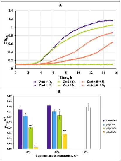Effect of Z. mobilis culture aeration on the inhibitory effect of its culture supernatant on E. coli growth: (A) effect of Z. mobilis culture supernatants (at 50% final concentration) from aerobically or anaerobically cultivated strains Zm4, Zm6, and Zm6-ndh; (B) dependence of the inhibitory properties of the supernatants from Zm4 batch cultures grown in fermenters at various set pO2 values. Empty bar, E. coli specific growth rate without any additions. * p < 0.05; *** p < 0.001.