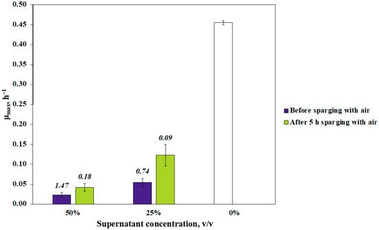 Effect of gassing of aerobically grown Zm4 culture supernatant with air on its growth-inhibitory properties. The acetaldehyde concentration (mM) in the E. coli culture media after addition of the Zm4 culture supernatant is shown on top of the bars. Empty bar, E. coli specific growth rate without any additions. In all cases, supernatant addition significantly decreased the growth rate (p < 0.001).