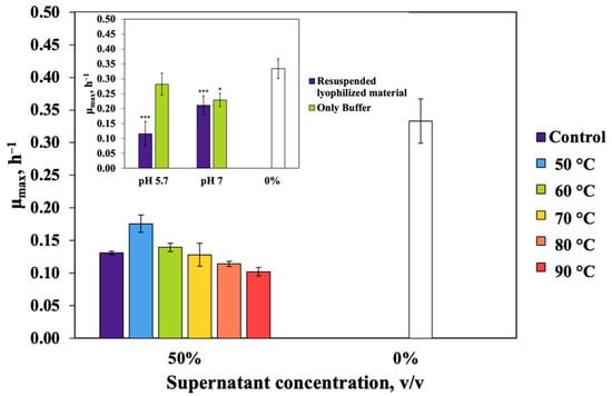 Effects of temperature and pH on antimicrobial activity of the Zm4 culture supernatant. Effect of thermal pretreatment at various temperatures on the E. coli specific growth rate. Duration of pretreatment, 20 min; control, without pretreatment. In all cases, supernatant addition significantly decreased the growth rate (p < 0.001). Inset: The pH dependence of the inhibitory effect of concentrated Zm4 culture supernatant in 0.2 M citrate buffer. Empty bars, E. coli specific growth rate without any additions. * p < 0.05; *** p < 0.001.