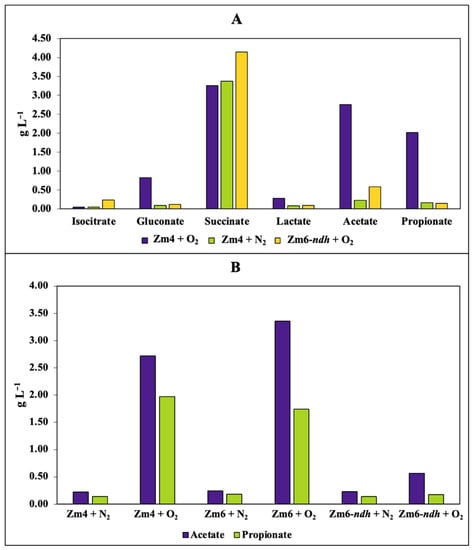 Acid byproducts in Z. mobilis stationary-phase batch cultures: (A) accumulation of acids in aerobically vs. anaerobically cultivated strain Zm4 and aerobically grown respiratory mutant Zm6-ndh; (B) dependence of acetate and propionate accumulation on aeration in the strains Zm4, Zm6, and Zm6-ndh. Representative results of one experiment in a series are presented.