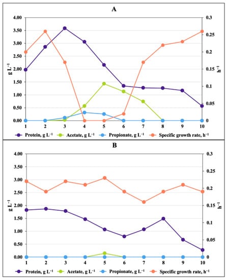 During our initial attempts to verify if the antimicrobial compound was a low-molecular-mass peptide, we separated the lyophilized and 10-fold concentrated fermentation medium by size-exclusion chromatography on a Sephadex G-25 (superfine) column. After passing through the column, the antimicrobial activity of the aerobic culture of Zm4 appeared in several fractions (Figure 7A). The increased propionate and acetate concentrations in these active fractions (No. 4 to 7) mirrored their inhibitory effect on the specific growth rate of E. coli. In the corresponding fractions from the anaerobic culture lacking antimicrobial activity, no propionate and almost no acetate were present (Figure 7B). Thus, the size-exclusion chromatography step allowed to concentrate the active compound(s), indirectly supporting the key role of acetate and propionate in the antimicrobial effect. However, as seen in Figure 7A, the protein content was also elevated in some of the active fractions from the aerobic culture supernatant.