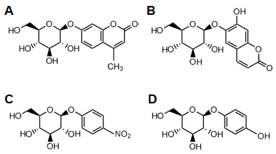 Most common surrogate substrates for the detection of β-glucosidase activities. (A) 4-MUG, (B) Esculin, (C) pNPG, (D) Arbutin.