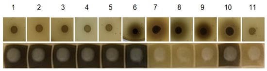 Comparison of esculin-based β-glucosidase activity detection on agar plates and in liquid culture. The β-glycosidic activity of commercial wine yeasts was detected by the occurrence of dark staining after cultivation on esculin-agar plates (top row) and in liquid esculin-containing media (bottom row). Details are described in the material and methods section. 1: Kitzinger Champagner, 2: Kitzinger Portwein, 3: Kitzinger Universal, 4: Kitzinger Bordeaux, 5: Kitzinger Steinberg, 6: Kitzinger Aromatic, 7: Bioferm Blanc, 8: Bioferm Doux, 9: Bioferm Killer, 10: Bioferm Malic, 11: Bioferm Rouge.