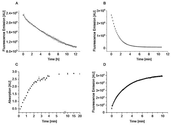 Photometric detection of β-glucosidase surrogate substrate hydrolysis in liquid assays. Shown are the resulting changes of signal intensity after the addition of almond β-glucosidase to a final concentration of 0.23 U mL−1 to 100 µL of a 5 mM glycoside solution ((A) arbutin, (B) esculin, (C) pNPG, (D) 4-MUG). Used wavelengths are given in the material and methods section. Experiments were conducted in triplicates. The values represent the mean values of three experiments and respective standard deviations.