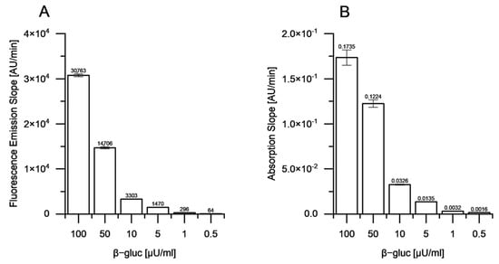 Comparison of enzyme activity quantification using 4-MUG or pNPG as surrogate substrates. The intensity increases of (A) 4-MU and (B) pNP signals after the addition of almond β-glucosidase to a final concentration of 100 µU mL−1, 50 µU mL−1, 10 µU mL−1, 5 µU mL−1, 1 µU mL−1 and 0.5 µU mL−1 are illustrated. The signal emission slopes were calculated from measurements for 5 min after the addition of almond β-glucosidase. Experiments were conducted in triplicates. The values represent the mean values of three experiments and respective standard deviations.