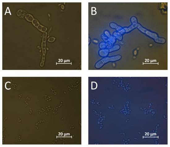 Visualization of 4-MU localization before (left) and after (right) the incubation of yeast cultures with 4-MUG. A. pullulans (A,B) and I. terricola (C,D) cultures were incubated with 4-MUG and analyzed via fluorescence microscopy as described in the material and methods section. The exposure time was identical for all pictures.