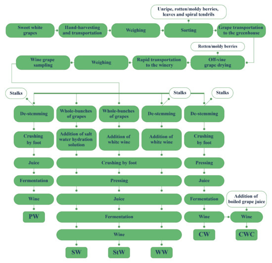 During the 2021 harvest, the fermentation was carried out individually in two large open-top 100-L stainless-steel cylindrical tanks (Fratelli Marchisio & C. S.p.A., Imperia, Italy) at an average temperature of 24 ± 1 °C. The juice was added to 80 mg/L potassium metabisulphite and 30 g/hL Fermol starter. The following steps were as described for the CW sample of the 2020 harvest.