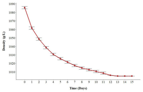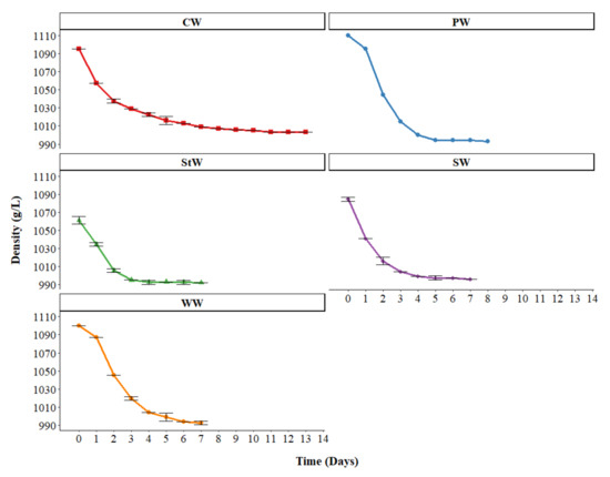The juice extraction by foot without pressing (prototropum) only enabled the procurement of juice for one trial. The amount of juice for the other modalities was enough to obtain experimental duplicates. After juice extraction and starter inoculation, the kinetics of fermentations were monitored from the beginning to the end of alcoholic fermentation (Figure 2). The density decreased below 1000 g/L in the PW, SW, StW and WW samples. In the case of CW sample, obtained from dried grapes, stuck fermentation occurred due to the higher initial content of sugar in the juice. The semi-industrial scale fermentation performed in 2021 is shown in Figure 3. As in 2020, stuck fermentation occurred at a density of 1005 g/L.