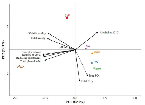 A Principal Component Analysis (PCA) was carried out on the whole data set considering the sulphite concentrations after addition. The first two principal components explained 84% of the total variability of the entire dataset in PCs of 100% (Figure 4). The PC1 axis yielded the highest variation (59.7%), whereas the PC2 axis yielded the lowest (24.3%). The PCA indicates that SW, PW, StW and WW samples were highly positively correlated with PC1 in terms of free and total sulphur dioxide, but showed a weak positive correlation with alcohol at 20 °C. The CWC sample has large negative loading on PC2, as expected from the lower ethanol and higher reducing substances, total dry extract and density at 20 °C.