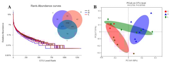 The rank-abundance curves are derived from the microbial OTU level. (A) The Venn graph illustrates the overlap of microbial OTUs among the treatment groups at a 3% dissimilarity level. (B) PCoA analysis of taxonomical classifications in the control (C) and mulberry silage (L, H) groups.