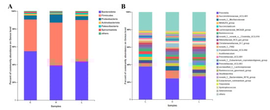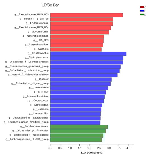 A total of 30 clades were identified as biomarkers among the three groups, of which nine were in Group C, 17 were in Group H, and four were in Group L (Figure 3). The nine clades identified in Group C included four genera belonging to Bacteroidota (Prevotellaceae_UCG_003, Prevotellaceae_UCG_004, norank_f_251_o5, and Rikenellaceae_U29_B03), two genera belonging to Proteobacteria (Succinimonas and Anaerobiospirillum), and one genus belonging to Elusimicrobiota (Endomicrobium), Actinobacteriota (Corynebacterium), and Desulfobacterota (Mailhella). The 17 clades identified in Group H included two genera belonging to Bacteroidota (Rikenellaceae_SP3_e08 and unclassified_o_Bacteroidales), 14 genera belonging to Firmicutes (Lachnoclostridium, Shuttleworthia, Syntrophococcus, unclassified_f_Lachnospiraceae, Ruminococcus_gauvreauii_group, Eubacterium_ruminantium_group, norank_f _Selenomonadaceae, Dialister, Eubacterium_eligens_group, Coprococcus, Monoglobus, Lactobacillus, Catonella, and Lachnospiraceae_XPB1014_group) and one genus belonging to the Desulfobacterota (Desulfovibrio). The four clades identified in Group L included three genera belonging to Firmicutes (Saccharofermentans, unclassified_p_Firmicutes, and Lachnospiraceae_FE2018_group) and one genus belonging to Actinobacteriota (unclassified_f_Atopobiaceae).