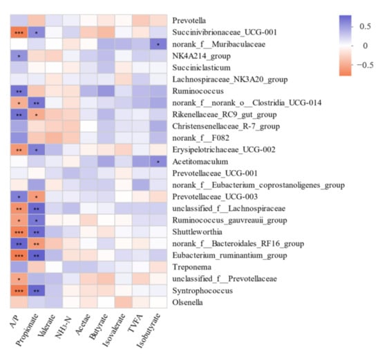 Correlation analyses between the fermentation characteristics and top 25 rumen bacterial genera. The blue squares show the positive correlations, while orange squares show the negative correlations. * p < 0.05; ** p < 0.01; *** p < 0.001. NH3-N = ammonia nitrogen, A/P = the ratio of acetate to propionate, TVFA = total volatile fatty acid.