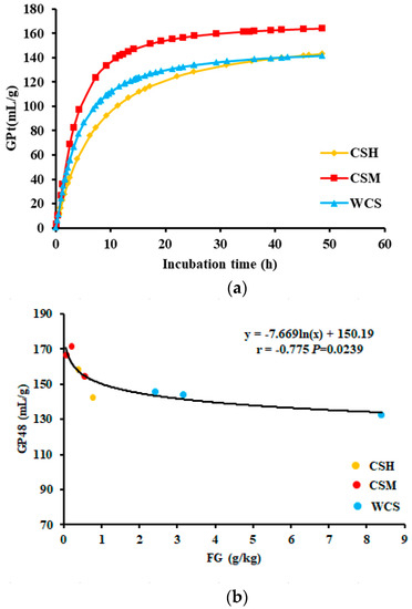 In the present study, cumulative gas production at 48 h ranked as follows: CSM > CSH > WCS (p < 0.01) (Figure 2a), suggesting that CSM presented the highest content of soluble carbohydrate among three kinds of samples. Raji et al. [27] compared the in vitro gas production characteristics of WCS and cottonseed cake and found that the cumulative gas production of WCS and cottonseed cake reached 40 and 115 mL/g at 24 h, respectively, so it was much lower than the results in the current study. They did not provide information on the gossypol contents in the samples, so it was uncertain if there might be an inhibitory effect of a high gossypol content. Meanwhile, we speculated this difference might also be due to the methodological accuracy to record gas production. The average gas production rate ranked as: CSM > WCS > CSH (p < 0.01) (Table 3), and it was consistent with the constant degradation rate of dry matter, but contrary to the time at which half of the maximum gas production was reached, such results noted that CSM presented a faster fermentation speed in the rumen than WCS and CSH. According to the results of the correlation analysis, the FG content was highly negative associated with cumulative gas production (r = −0.77, p = 0.02) (Figure 2b), and the inhibition was more obvious when the gossypol content exceeded 2 g/kg, suggesting that there was a detrimental effect of the high gossypol content originating from cottonseed and its by-products on their rumen microbial fermentation efficiency.
