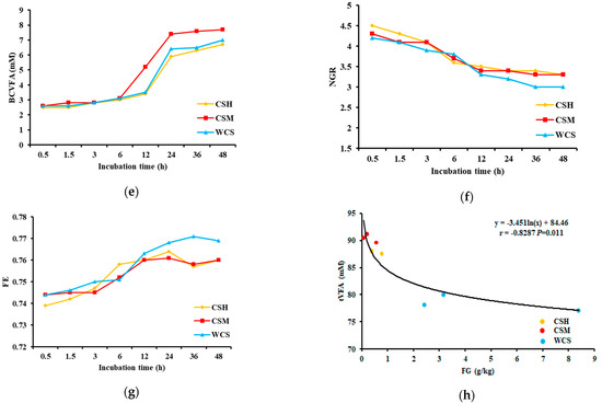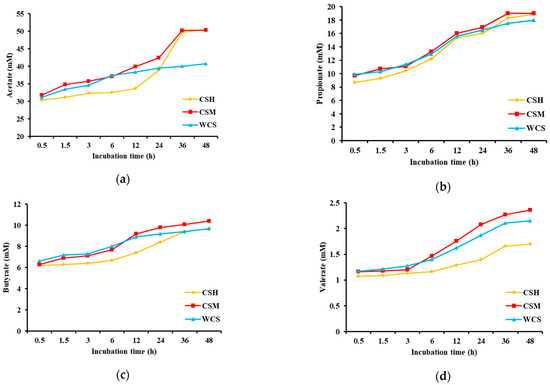 Generally, VFAs are the main energy donor of ruminants, and the FE of energy from carbohydrates to VFAs was negative correlated with non-glucogenic fatty acid production and NGR. In the present study, WCS presented a higher FE of energy from carbohydrates to VFAs, which resulted from its lower acetate production compared to CSH and CSM. Meanwhile, NGR decreased when prolonging the incubation, which was consistent with the increase of FE (Figure 3).