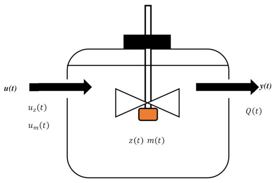 Graphical representation of the semi-batch-type bioreactor used for anaerobic digestion ( = bacterial input (kg/(m3/h)), = substrate input (kg/(m3/h)), = bacteria concentration (kg/m3), = substrate concentration (kg/m3), and = biogas flow rate (m3/h)).