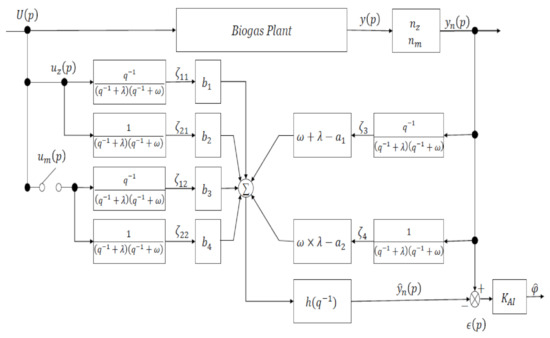 The original parameters of the model shown in Equation (6) were changed to and . Once the values had been estimated, biogas generation could be predicted by inputting the bacteria and substrate concentrations in the feedstock into Equation (10). An adaptive identifier was developed using the adaptive identification theory to estimate the parameters from real operational data [5,29]. The adaptive identifier shown in Figure 3 was used as the control system. Input and output data were multiplied by the filter to produce the control signals in the adaptive identifier. The control signals were multiplied by the operating parameters and then integrated, and the linear relationship between output and the parameters with the proportionality constant as the control signal was derived using Equation (11):