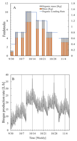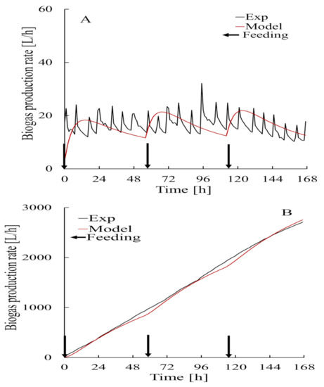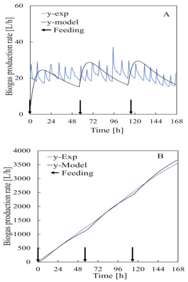 Experimental data used to construct the model and perform a simulation for the feedstocks (A) and for biogas Production rate (B).