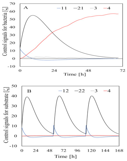 Control signals related to bacteria and substrate inputs (A) and outputs (B). is the control signal, and the numbers in the figure legends are the subscript values for the control signals.