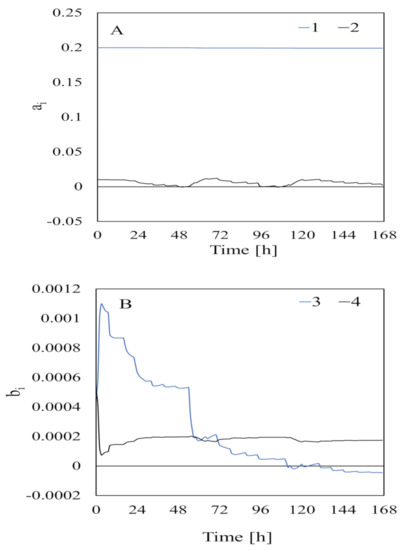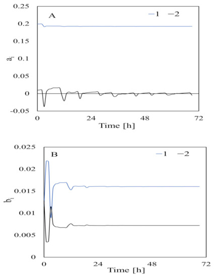 The parameters estimated using data collected when the feedstock had not been added are shown in Figure 6. The estimated parameters were very variable at first but slowly stabilized as the acquired data increased and became stable at ~20 h [5]. This indicated that data needed to be collected for at least 20 h to estimate the parameters related to bacterial input. The parameters estimated from data collected when the feedstock had been added (i.e., for identification of adaptation caused by “turning on the switch” by adding substrate) are shown in Figure 7. The parameter estimates varied greatly at the beginning of the experiment but became stable at 140 h. Therefore, data needed to be collected for at least 140 h to estimate the parameters related to substrate input. This was slightly different from the time found by [5] after assessing the composition of the substrates in a bioreactor.
