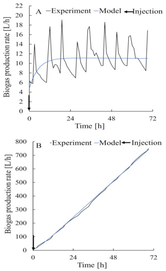 The substrate concentration was determined from the loss of mass when the feedstock was heated to 105 °C for 24 h and then to 600 °C for 3 h. The data used in the simulation were experimental data collected in the laboratory in 2018 (Figure 4). Bacterial input at 0 h was defined as the amount of substrate in the digestate at the beginning of the process [30]. Feedstock input was determined at 0, 52, and 104 h. Data for 3 d (i.e., 72 h) from 30 September 2018, when no feedstock was added, and for 7 d (i.e., 168 h) from 7 October 2018, when feedstock was added, were used to estimate the parameters when developing the model. Data for 7 d (i.e., 168 h) from 21 October 2018 were used to validate the model. The organic loading rates for the model construction period and the model validation period were different at 1.47 and 1.24 (kg volatile solid)/(m3 digester/day), respectively.