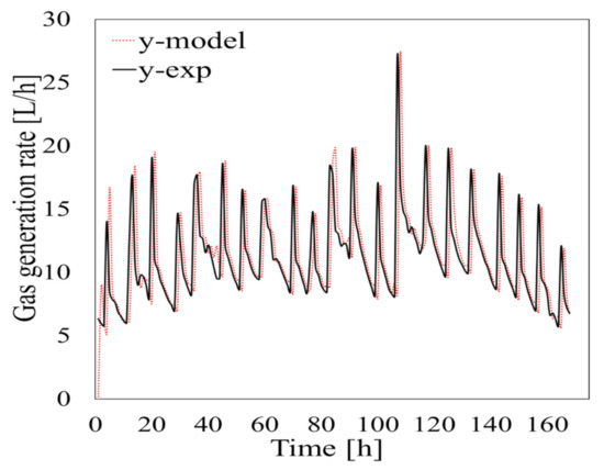 The results of the validation tests performed using different data from the data used to construct the model are shown in Figure 10. These were carried out to confirm the accuracy of the prediction model. The initial bacteria concentrations for the period in which the data used to construct the model were acquired (30 September 2018 to 7 October 2018) and for the period in which the data used to validate the model were acquired (14–21 October 2018) were different. The initial bacteria concentration for 30 September 2018 to 7 October 2018 was 28 kg/m3 and the initial bacteria concentration for 14–21 October 2018 was 25 . The amount of biogas generated that was predicted using the validation data had a low GFI (−81.91%) because degassing (caused by agitation) and heating strongly affected the hourly data. Cumulative biogas generation data are shown in Figure 10. This indicated that the predictions were good.