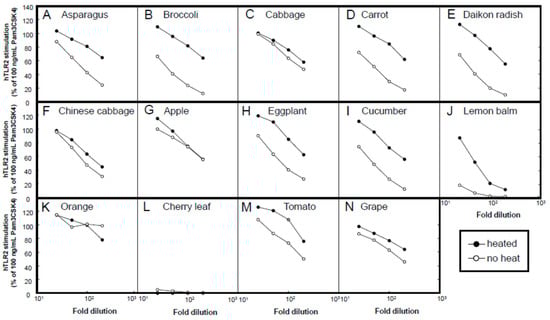A variety of plant materials, namely, from asparagus (stem of edible part), broccoli (stem of edible part), cabbage (edible part), carrot (edible part, root), daikon radish (edible part, root), Chinese cabbage (edible part), apple (fruit), eggplant (fruit), cucumber (fruit), lemon balm (leaf), orange (fruit), cherry (leaf), tomato (fruit), and grape (fruit), were subjected to hot water extraction. Unless otherwise mentioned, the plant bodies were mixed with purified water at a weight ratio of 1:2 and autoclaved (121 °C for 15 min). After the temperature was lowered to 40 °C or lower, the plant extracts were squeezed through a polypropylene mesh. The extract was stored at −20 °C or lower until further use. Among these plants, we chose asparagus as the main target for extensive examination, because (1) asparagus extracts have been used in cosmetics as skin conditioning agents [