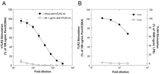 TLR2-stimulating activity was determined using a reporter cell system, HEK BlueTM hTLR2 cells (InvivoGen, Toulouse, France), according to the manufacturer’s instructions. In brief, the cells were cultivated in Dulbecco’s modified Eagle’s medium (Sigma-Aldrich, St. Louis, MO, USA) supplemented with a mixture of selective antibiotics for keeping the persistent expression of transgenes (HEK Blue selection, InvivoGen), in addition to other antibiotics for preventing the growth of microorganisms (penicillin, Fujifilm-Wako, Osaka, Japan; streptomycin, Fujifilm-Wako; and normocin, InvivoGen), and 10% fetal bovine serum (Equitech Bio, Kerrville, TX, USA) at 37 °C in a 5% CO2 atmosphere in a humidified chamber. For the assay, the cells were seeded in each well of a 96-well cell culture plate at a density of 2 × 105 cells/mL in 100 µL of the culture medium. After 2 d, 100 µL of the test samples, sterilized by membrane filtration (pore size = 0.2 µm) and diluted in the culture medium, was added to each well. As positive and negative controls, 200 ng/mL of Pam3CSK4 (final concentration 100 ng/mL) and the medium were used, respectively. After an additional 1 d of cultivation, 20 µL of the conditioned medium from each well was transferred to a fresh 96-well assay plate, 180 µL of Quanti Blue Solution (InvivoGen) was added, and the plate was incubated for 30 min at 37 °C. The absorbance of each well was determined at 655 nm using a microplate reader (Multiskan GO, Thermo Fisher Scientific, Waltham, MA, USA), and the average value of the negative control wells was subtracted from the values of all wells. TLR2-stimulating activity is expressed as the relative value to the average values of the positive control. When examining TLR4-stimulating activity, HEK Blue hTLR4 cells (InvivoGen) and 1000 ng/mL LPS (Lipopolysaccharide from Escherichia coli 0111:B4; Sigma-Aldrich) were used instead of HEK Blue hTLR2 and 100 ng/mL Pam3CSK4, respectively.